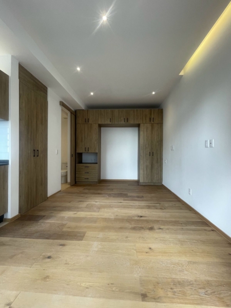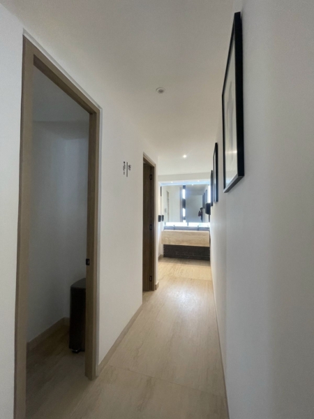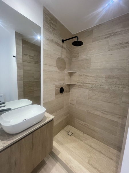 Madera de ingeniería en pisos, baños con mármol, carpintería de alta calidad.